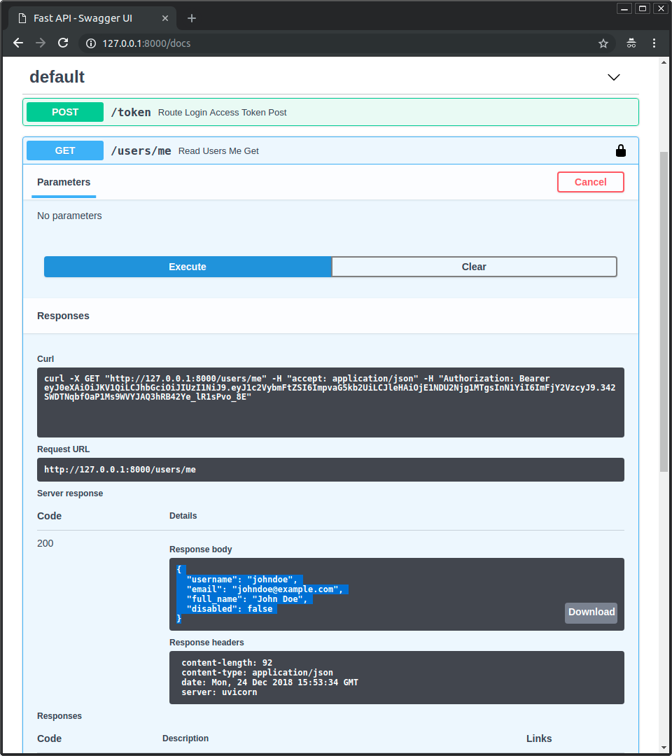 You can learn more in the Advanced User Guide about how to use OAuth2 "scopes", for a more fine-grained permission system, following these same standards. OAuth2 with scopes is the mechanism used by many big authentication providers, like Facebook, Google, GitHub, Microsoft, Twitter, etc. to authorize third party applications to interact with their APIs on behalf of their users.